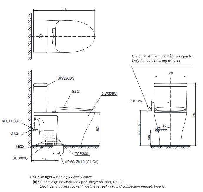 Chi tiết thông số của bàn cầu hai khối CS326DT10 kết hợp nắp đóng êm TC395VS: