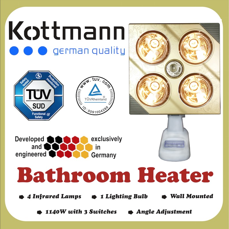 KOTTMANN – dòng sản phẩm trung cấp của Häns – là thương hiệu đèn sưởi nhà tắm được mua nhiều nhất tại thị trường Việt Nam. Đèn sưởi 4 bóng treo tường – K4BG có đặc điểm chung của các dòng sản phẩm trong thương hiệu KOTTMANN là thiết kế xuất sắc, phối màu hợp lý, giá cả phải chăng, chất lượng tin cậy, phù hợp với hầu hết các gia đình trung lưu tại Việt Nam.
