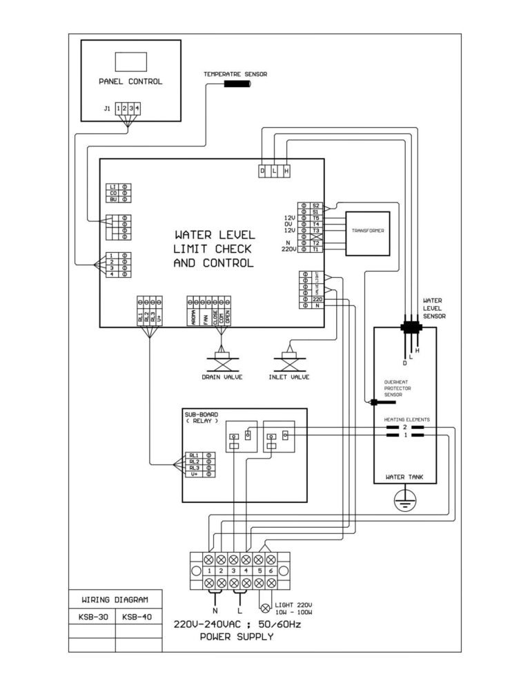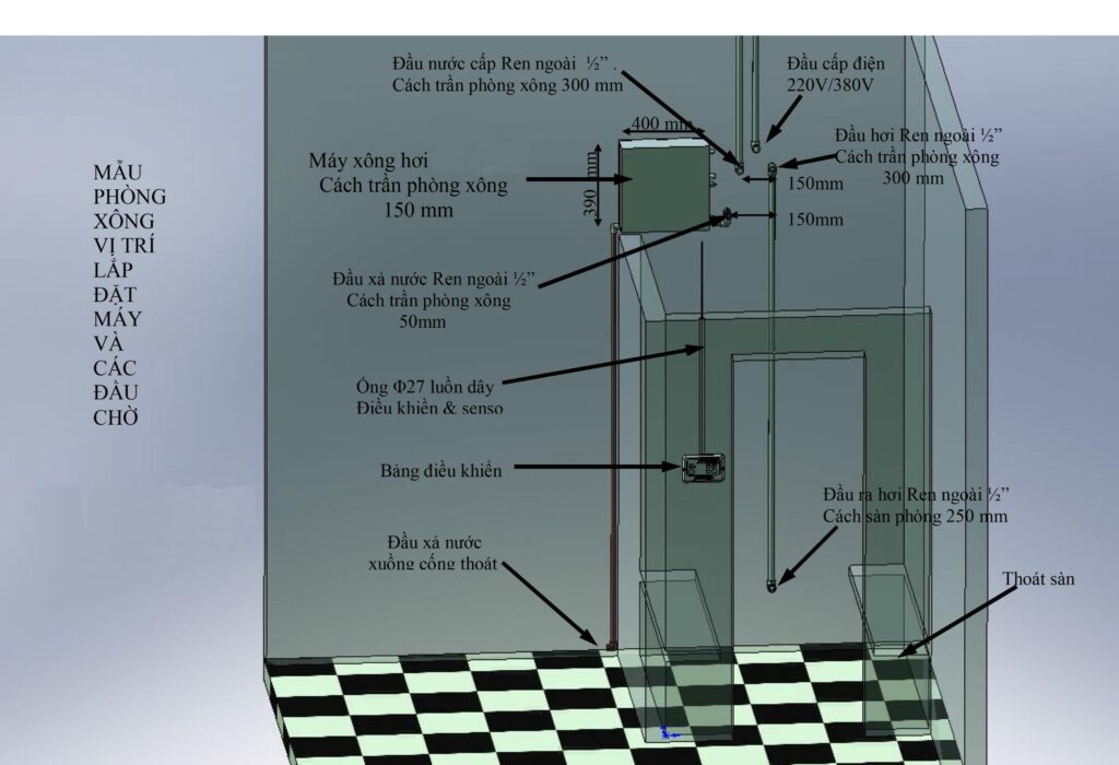 Sau khi đấu xong điện và điều khiển máy xông hơi. Cố định treo máy ta tiến hành kết nối nước cấp, ống hơi, ống xả cặn theo các ống đã chạy . Công việc này khá đơn giản chỉ cần làm theo sơ đồ hướng dẫn.