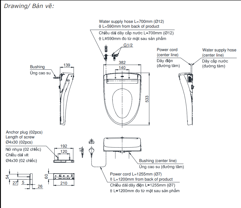 Dưới đây là bản vẽ kỹ thuật chi tiết của nắp rửa điện tử WASHLET TCF34461GAA. Đây là thông tin cần thiết để hỗ trợ quá trình lắp đặt và bảo trì sản phẩm.
