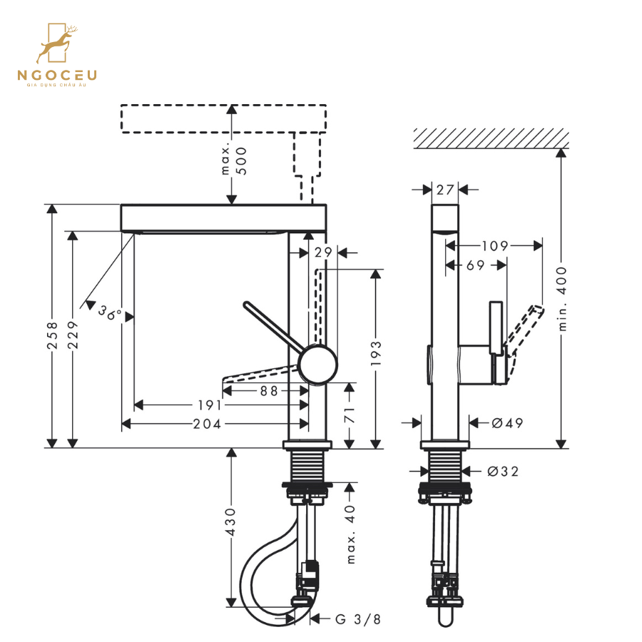 - Dễ lắp đặt: Kết nối nhanh chóng qua ống nối mềm tiêu chuẩn G ⅜ (DN15), phù hợp với nhiều kiểu lắp đặt.